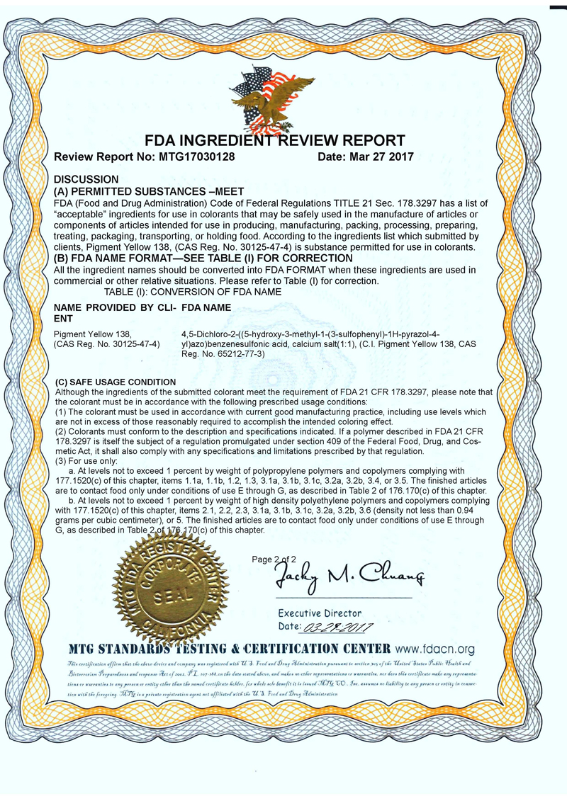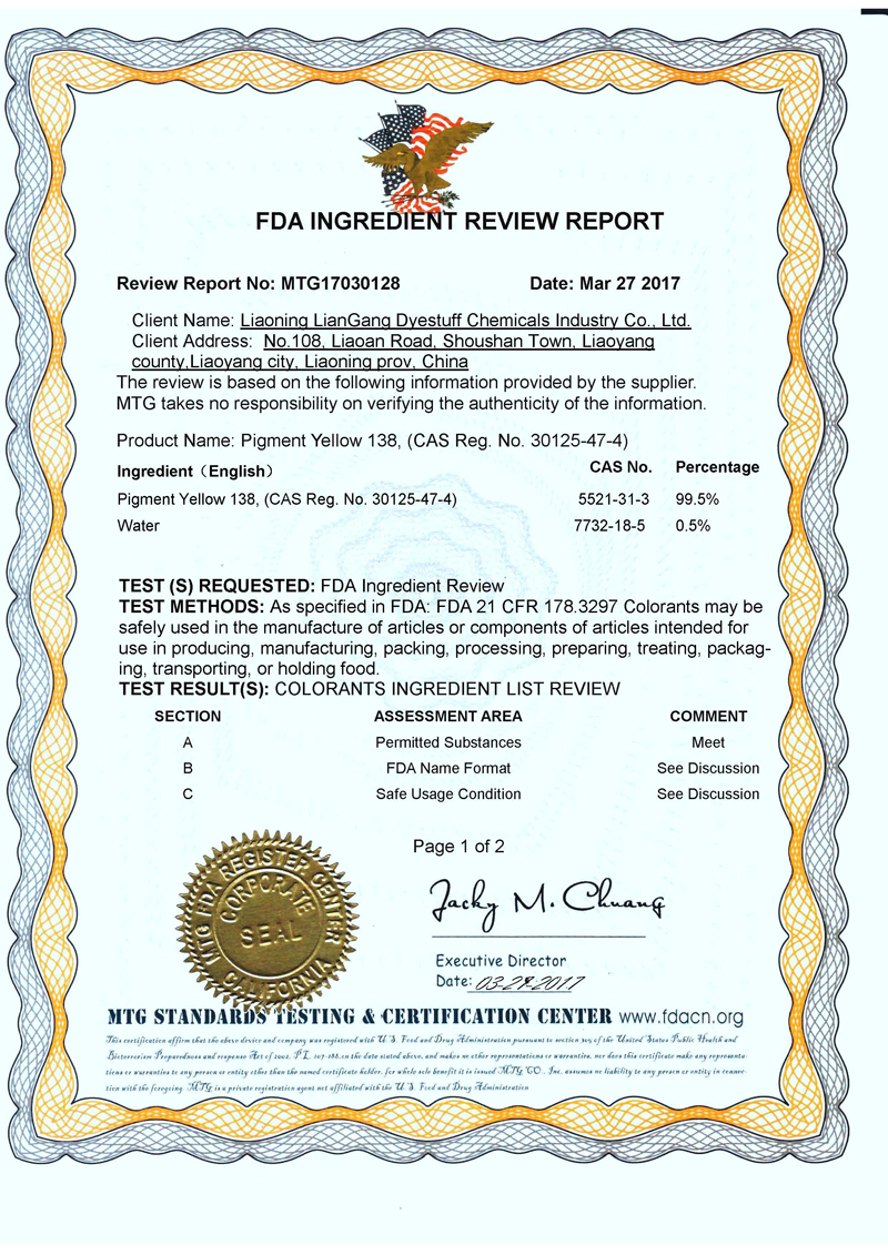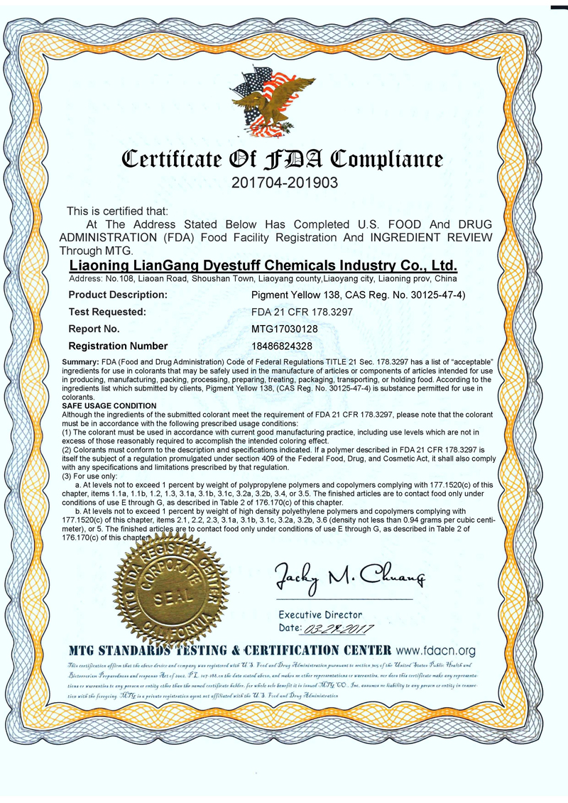 颜料黄138 (Pigment Yellow 138) 已通过FDA认证